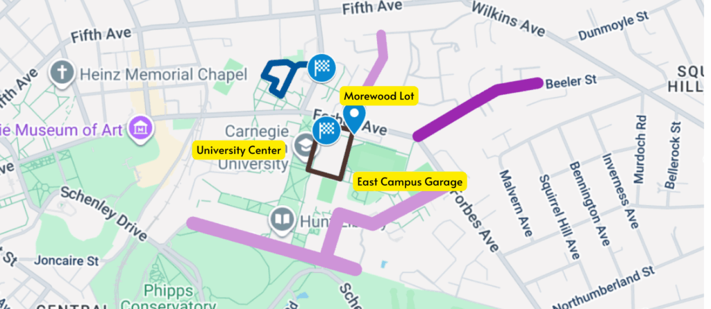 Beeler Street: Just off Forbes Ave across from the end of the East Campus Garage. Parking is free after 7pm on Friday and all weekend. This is a residential area. Walk down to Forbes and on down to the University Center. Coordinates: (40.44394 –79.93872).