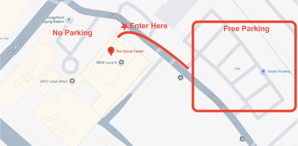 After crossing the Hot Metal Bridge make the second left in front of the Circuit Center onto Sidney St. The parking lot is just past Circuit Center, on the left and is free. If this large lot fills up there is limited street parking north of the venue are paid parking garages in the area, the closet being The Hot Metal Garage at 2822 Sidney St, Pittsburgh, PA 15203